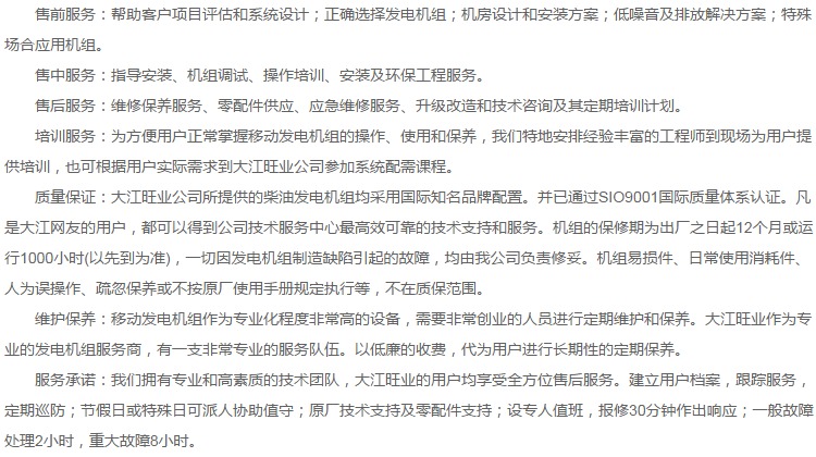 大江旺業(yè)提供各種型號(hào)規(guī)格小型發(fā)電機(jī)組銷售、出租、維修、保養(yǎng)及安裝服務(wù),信譽(yù)保證,價(jià)格公道,歡迎新老客戶來電咨詢。